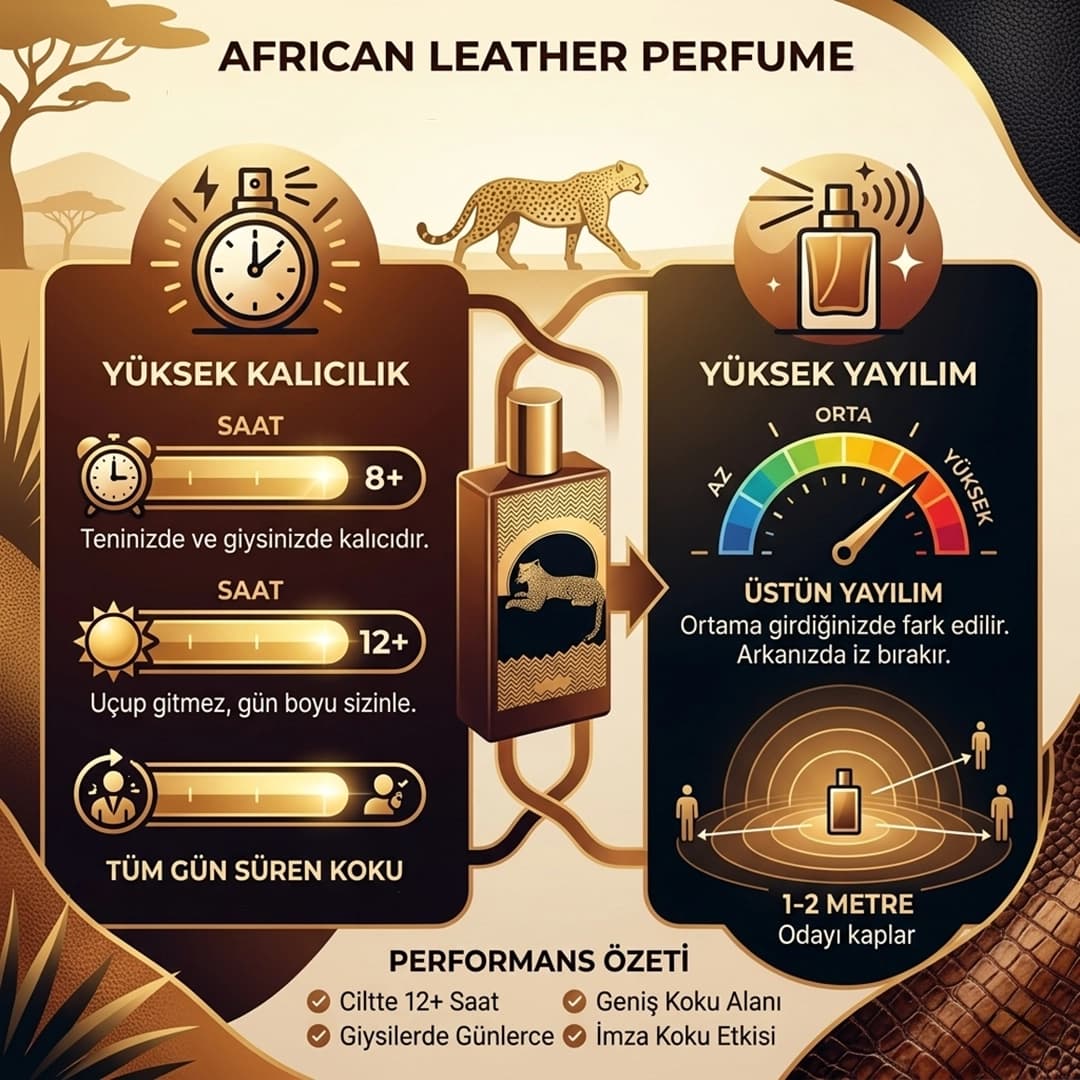 İlk saatlerde oldukça belirgin bir yayılım gösterir ve uzun süre ciltte kalabilir. Bu nedenle birçok kullanıcı African Leather’i en kalıcı niş parfümler arasında gösterir.